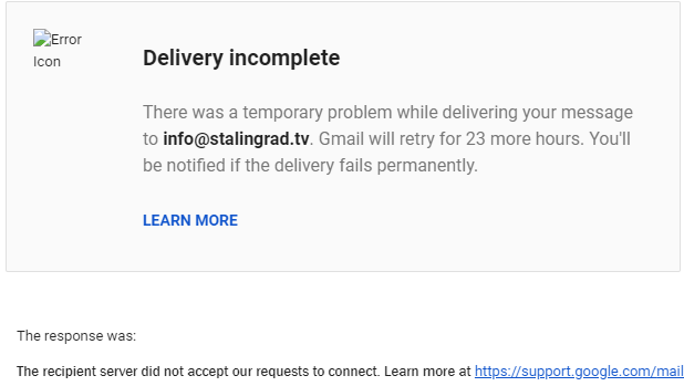 У Сталинграда фальшивая почта info@stalingrad.tv Отказывается принимать письмо.