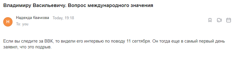 Приближается очередная годовщина событий 11 сентября 2001 года в Америке. Давно позабытого, но не всеми. Сейчас была озвучена настоящая правда о ЯДЕРНОМ подрыве башен ВТЦ, который превратил их порошок. За всем стояли масоны, которые хотели подставить российское, американское, израильское правительство. Выступил Евгений Гильбо, известный специалист, с этой темой, были сделаны фильмы - если Вам, Владимир Васильевич, это интересно, я пришлю ссылки и сами видео, после того, как Вы ответите мне на это письмо (иначе оно попадет в спам). Хотелось бы, чтобы Ваша организация озвучила и подняла этот вопрос, он касается России и всего что последовало после 11 сентября, включая ковид (масонские забавы), невойну на Украине, подмену Путина двойником. К вам не так давно уже звонили по телефону с просьбой связаться, но вы, наверное не обратили внимание (звонил Халезов Д. А. и оставил свой номер — перезвоните ему).